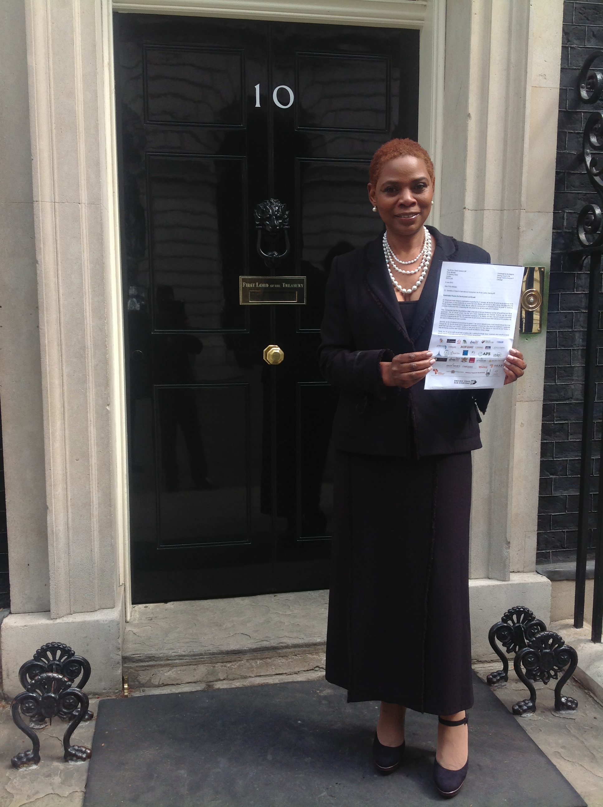 Justina Mutale in her capacity as Diaspora Ambassador & Spokesperson of the “ENOUGH FOOD FOR EVERYONE IF Campaign” at Number 10 Downing Street, delivering a letter to the British Prime Minister, David Cameron to take to the G8 Summit (2013) outlining the demands of the Diaspora on ending world hunger.
