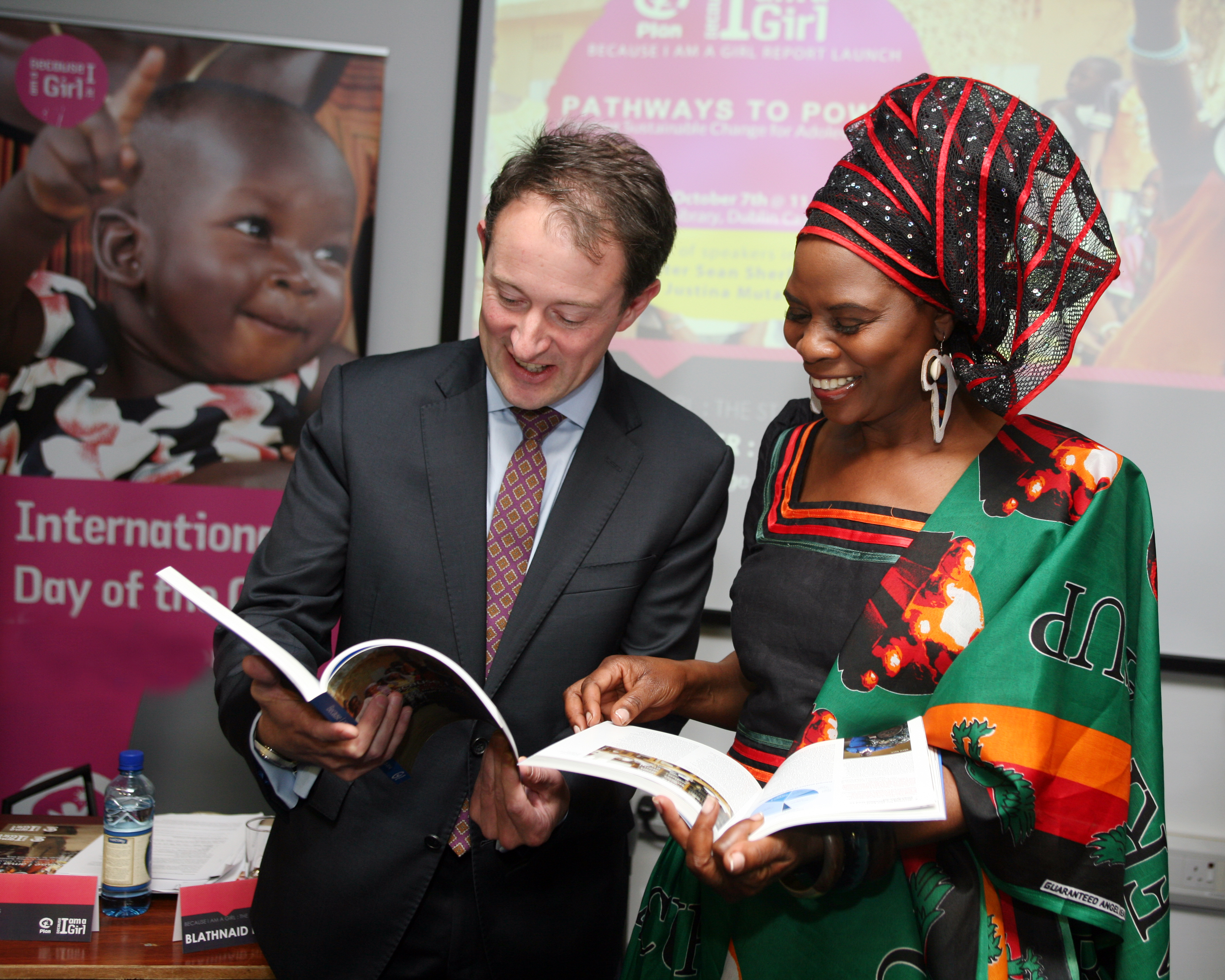 Justina Mutale launched the report on “PATHWAYS TO POWER: Creating Sustainable Change for Adolescent Girls” part of the Plan International Ireland’s series of BECAUSE I AM A GIRL REPORT that looks at the state of girls in the world. Justina was joined by the Irish Minister of State for Foreign Affairs and Overseas Development, Mr Sean Sherlock to mark the 2014 United Nations International Day of the Girl. 7t October 2014, Chester Library, Dublin Castle, Ireland.