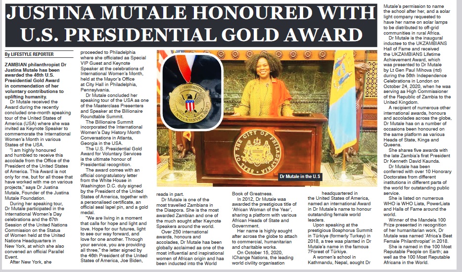 ZAMBIAN philanthropist Dr Justina Mutale has been awarded the 46th U.S. Presidential Gold Award in commendation of her voluntary contributions to uplifting humanity.