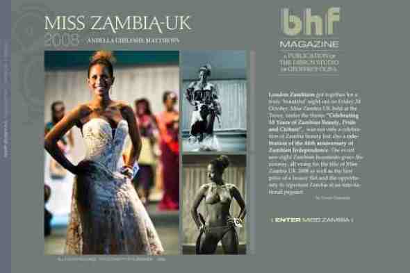 MISS ZAMBIA UK BEAUTY PAGEANT is a multi-award winning and internationally acclaimed beauty Pageant. It has been running for 12 years and is the only pageant in the UK that has international affiliation and owns franchises for approximately 20 international beauty pageants spread across the world. It is also the only pageant in which all finalists get an international modeling contract.